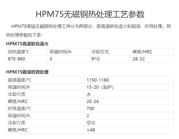 您好,以下是HPM75無(wú)磁鋼熱處理工藝參數(shù):